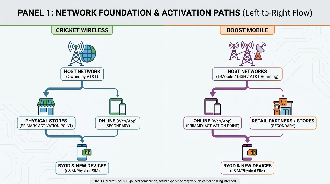 Explore the differences between Cricket Wireless and Boost Mobile in 2026, focusing on host networks, plan structures, 5G availability, and BYOD options.