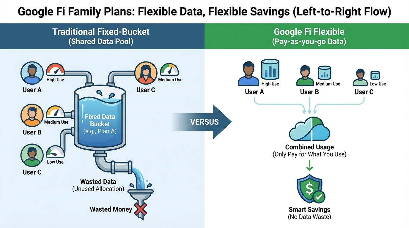 Google Fi's family plans offer savings by allowing families to mix Flexible and Unlimited plans per line, leveraging Bill Protection, and avoiding data waste.