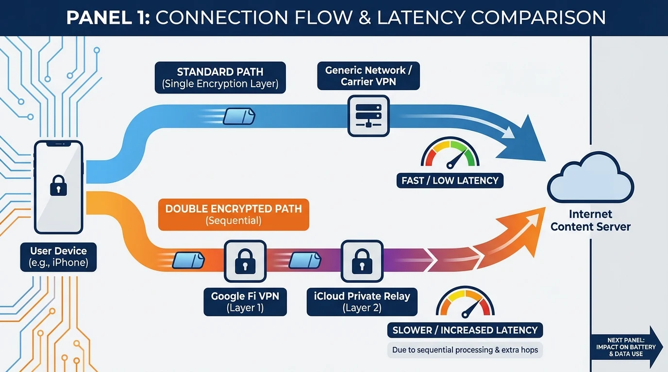 Using both Google Fi VPN and iCloud Private Relay can lead to double encryption, which often results in increased latency and slower internet speeds. This is due to the added overhead of encrypting and decrypting data twice, as well as the sequential hops involved in the relay process.