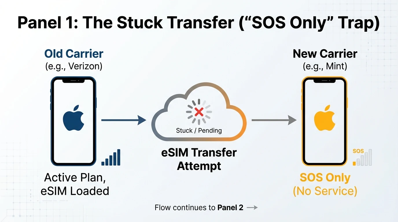Step-by-step recovery guide for resolving eSIM transfer issues when switching from Verizon to Mint Mobile, focusing on carrier activation delays and support boundaries.